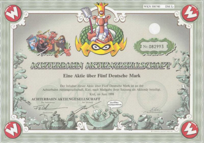 Die von der namhaften Geld- und Wertpapierdruckerei Giesecke & Devrient GmbH gefertigten Aktienurkunden sind ausgesprochen aufwendig gestaltet. Das hochwertige Papier hat Wasserzeichen und über der laufenden Nummer ist das Logo der Achterbahn AG geprägt. Links neben König Werner haben sich die Achterbahn-Gründer Rötger `Brösel´Feldmann und Jens Nieswand als Comicfiguren verewigt. Von beiden ist auch eine Faksimileunterschrift auf der Urkunde zu finden. Im Hintergrund ist Werners legendäre 4-Motoren Horex zu sehen, mit der er gegen Holgis Porsche angetreten ist. Am Rand gibt es ein Wiedersehen mit vielen bekannten Figuren aus den Werner-Comics. Am auffälligsten ist unten in der Mitte Meister Röhrich mit einem sanitären Anlagenpapier