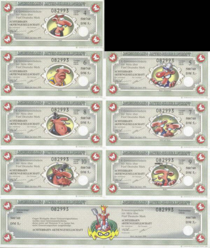 Original Achterbahn-Aktien und dazugehörigem Bogen - Gewinnanteilscheine (4 bis 10) und Erneuerungsschein in 1a Zustand!